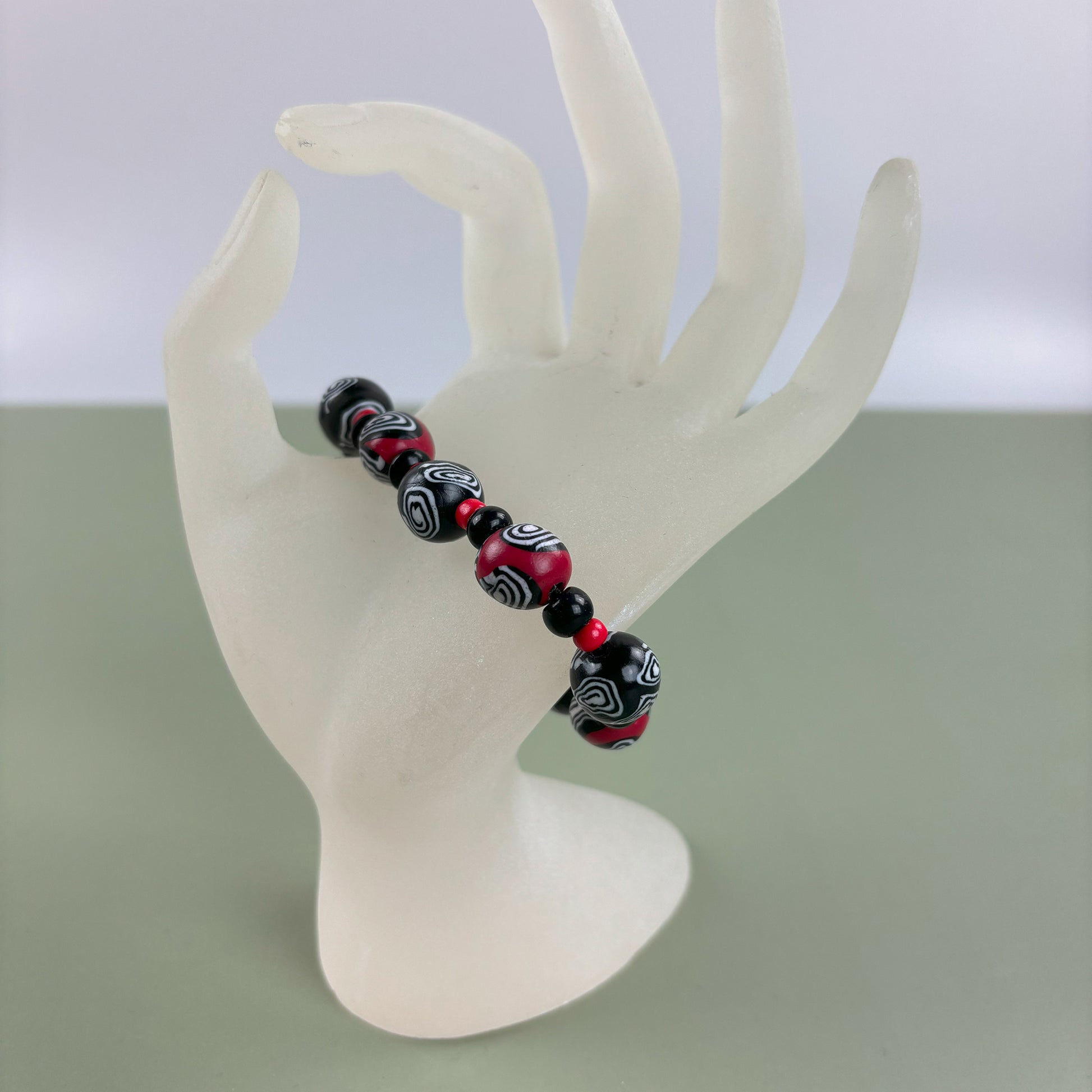 Mystic Swirl – Handgefertigtes Perlenarmband in Schwarz-Rot mit einzigartigem Spiralmuster
