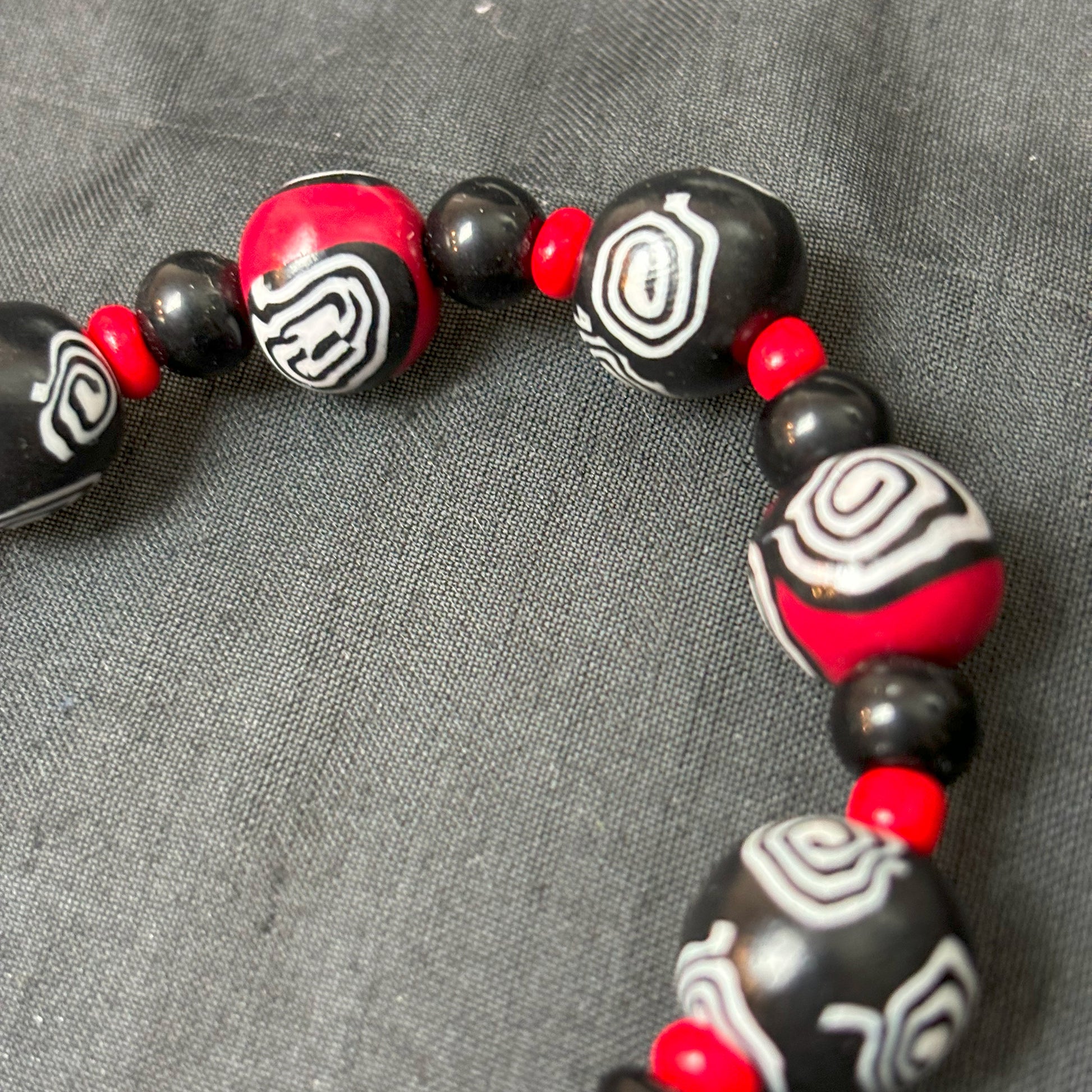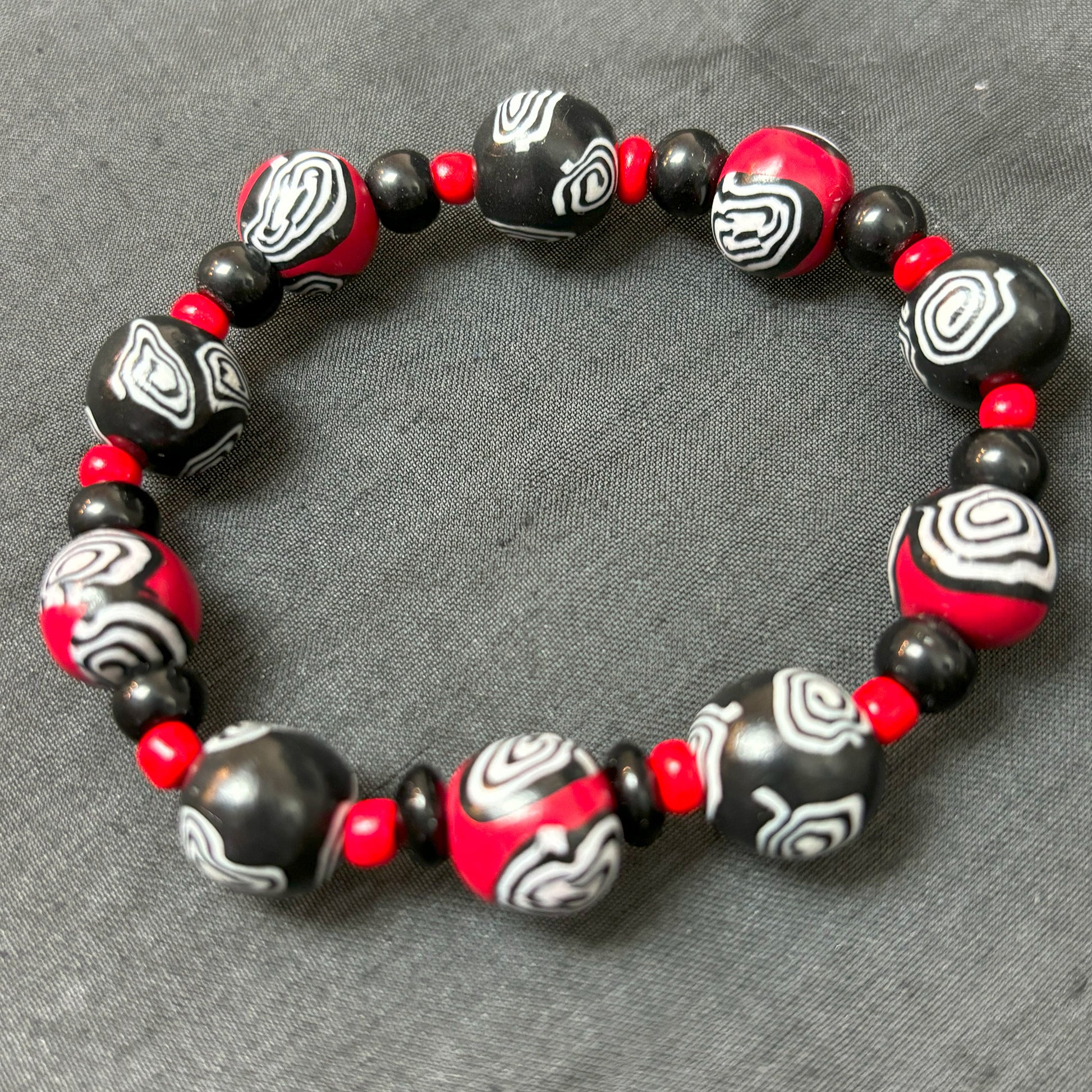 Verleihe deinem Outfit eine kraftvolle Note mit dem Mystic Swirl Armband – einem stilvollen, handgefertigten Schmuckstück, das mit seiner einzigartigen Farbkombination aus Schwarz, Rot und Weiß sofort ins Auge fällt. Die kunstvoll gestalteten Perlen mit spiralförmigem Muster machen dieses Armband zu einem echten Hingucker und Ausdruck deiner Individualität.