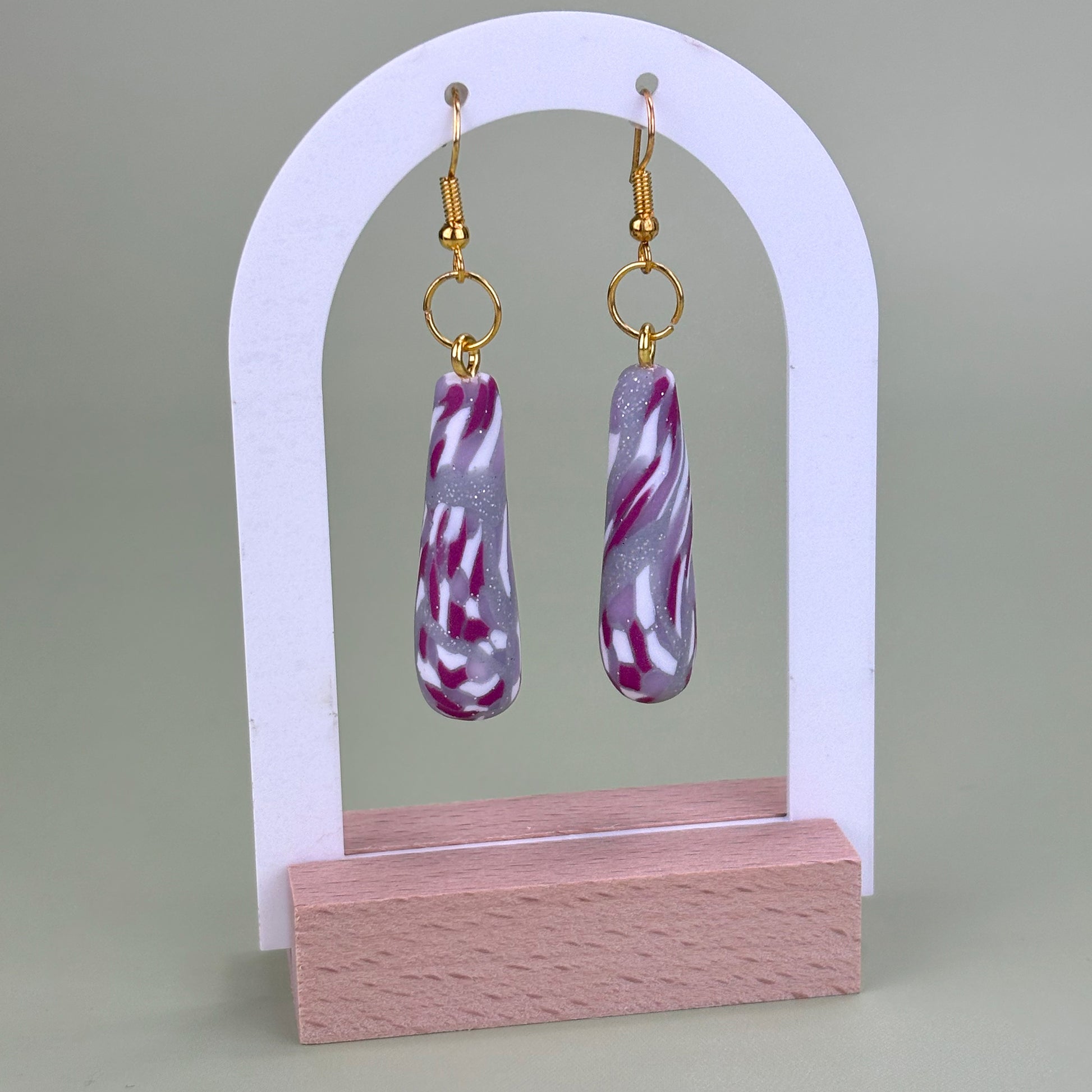 Diese handgefertigten FIMO Ohrringe sind ein wahres Kunstwerk. Die markanten Anhänger in marmoriertem Lila und Weiß zeichnen sich durch ihren eleganten, swirlartigen Look aus und verleihen jedem Outfit einen modernen und frischen Akzent. Der goldene Ohrhaken sorgt für einen luxuriösen Touch und garantiert gleichzeitig einen sicheren Halt. Diese modischen Ohrringe aus Polymer Clay sind die perfekte Wahl für alle, die auf der Suche nach einem einzigartigen Schmuckstück mit einem verspielten, aber dennoch stilvollen Design sind. Ob für den Alltag oder besondere Anlässe, diese Ohrringe setzen deine Persönlichkeit auf besondere Weise in Szene.