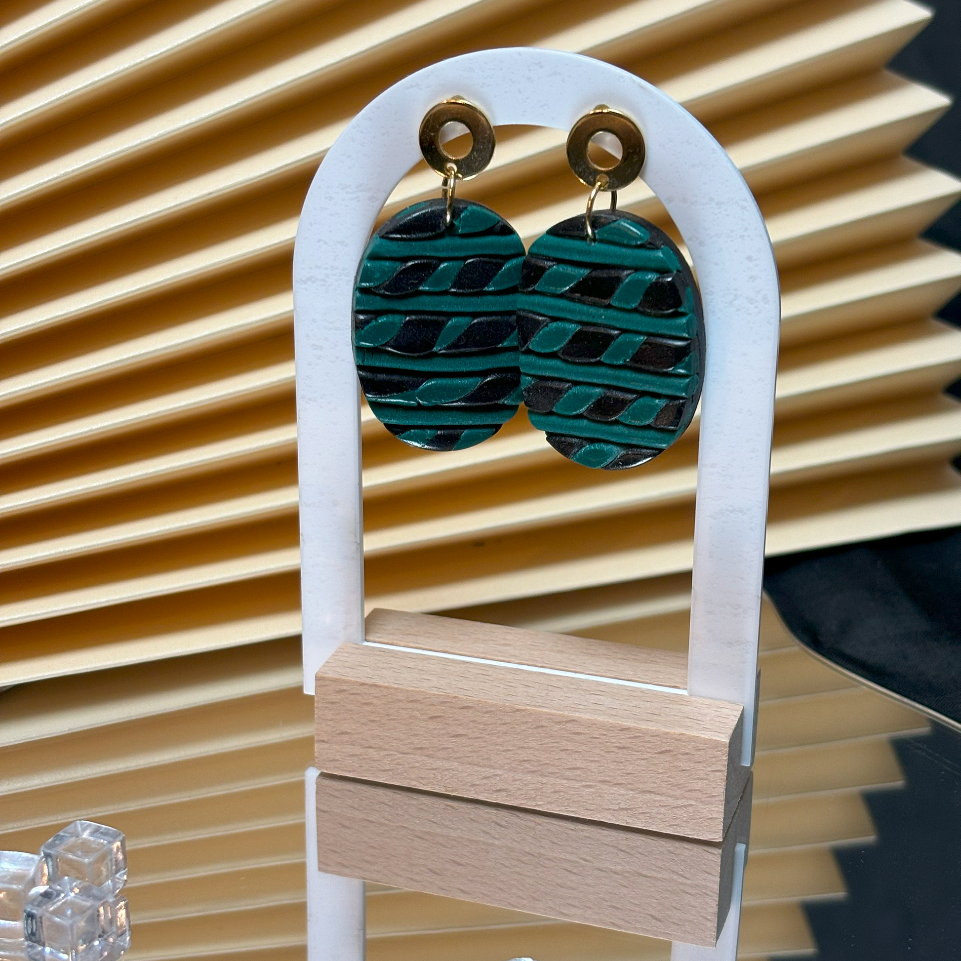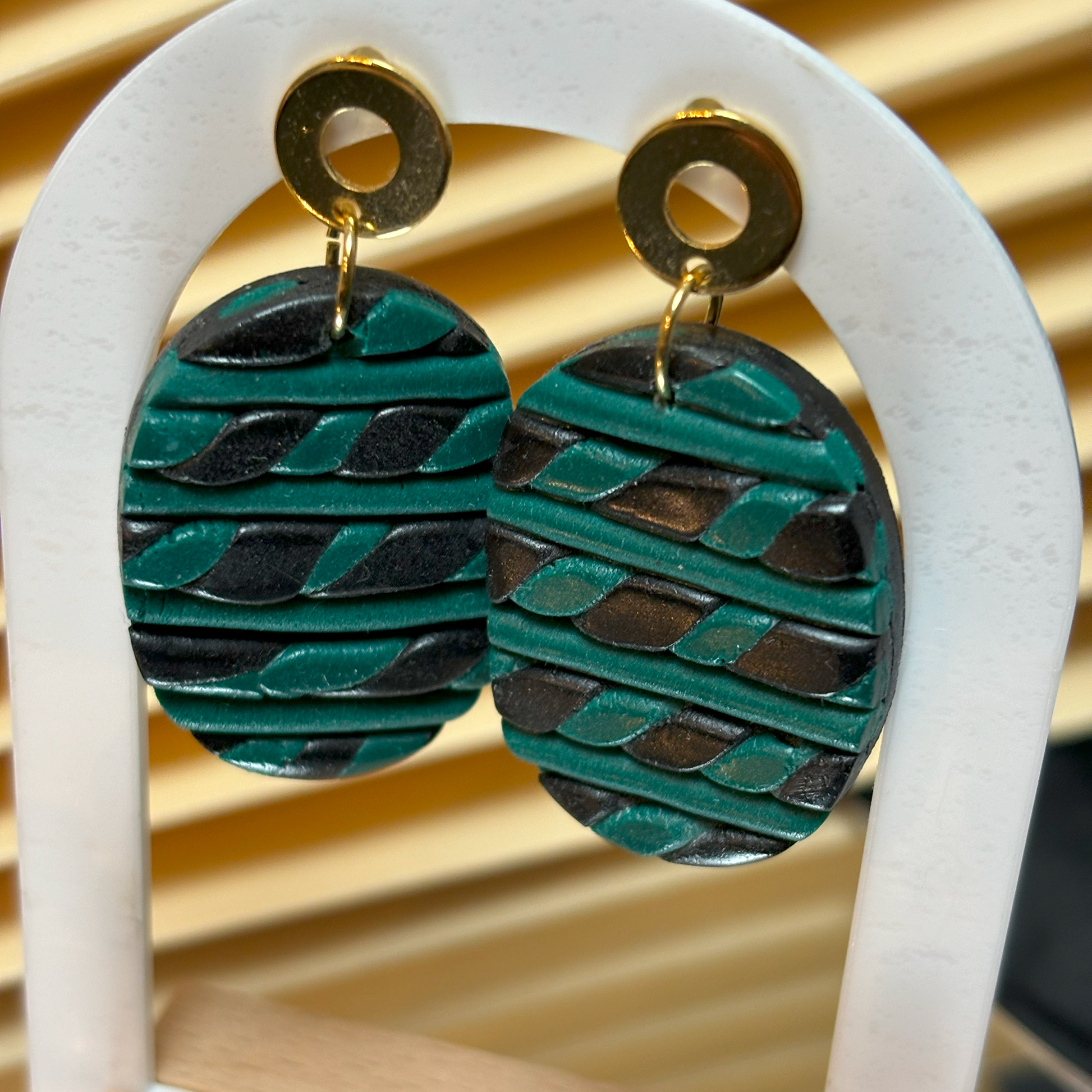 Diese handgefertigten FIMO Ohrringe kombinieren modernes Design mit edler Handwerkskunst. Die ovalen Anhänger sind in einem auffälligen Grün-Schwarz-Muster gestaltet und zeigen filigrane, geschichtete Details, die ihnen eine einzigartige Textur und Tiefe verleihen. Der vergoldete Ohrstecker sorgt für einen luxuriösen Touch und einen sicheren Halt, der den ganzen Tag über bequem bleibt. Diese modischen Ohrringe sind das perfekte Accessoire für stilbewusste Frauen, die geometrische Akzente setzen und ihrem Look eine kreative Note verleihen möchten. Die FIMO Ohrringe sind ideal für sowohl den Alltag als auch besondere Anlässe und lassen sich vielseitig kombinieren. Mit ihrer hochwertigen Verarbeitung und dem einzigartigen Design sind sie ein absolutes Must-Have für jeden Schmuckliebhaber.