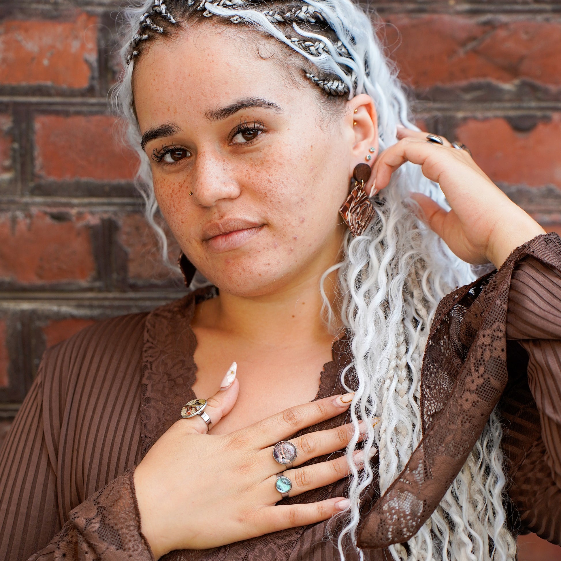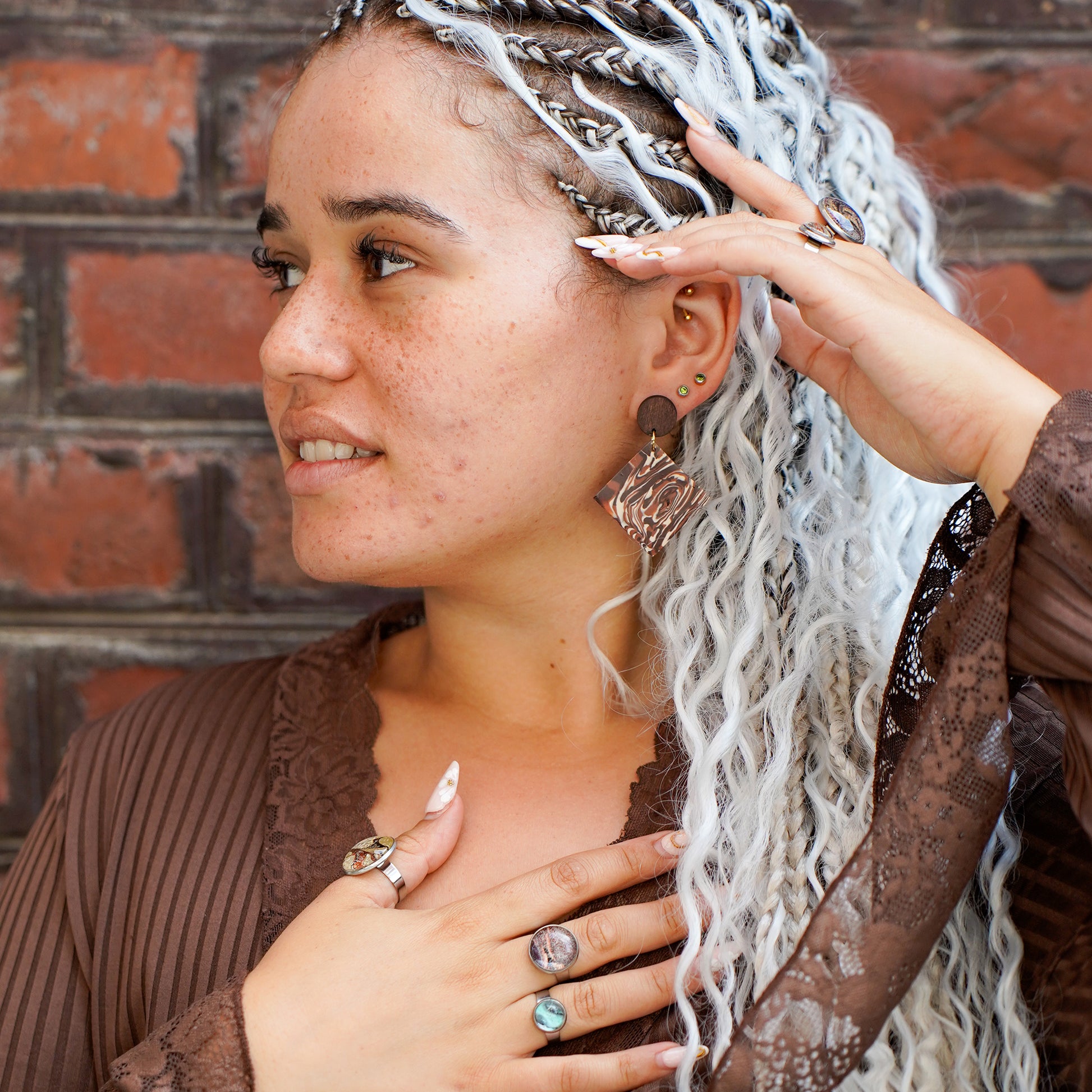 Handgefertigte Statement-Ohrringe, die natürliche Eleganz mit einem modernen Twist vereinen. Die marmorierten Muster in warmen Braun-, Beige- und Creme-Tönen erinnern an erdige Landschaften und fließende Naturformen – perfekt für stilbewusste Trägerinnen, die Wert auf Individualität und Handarbeit legen.